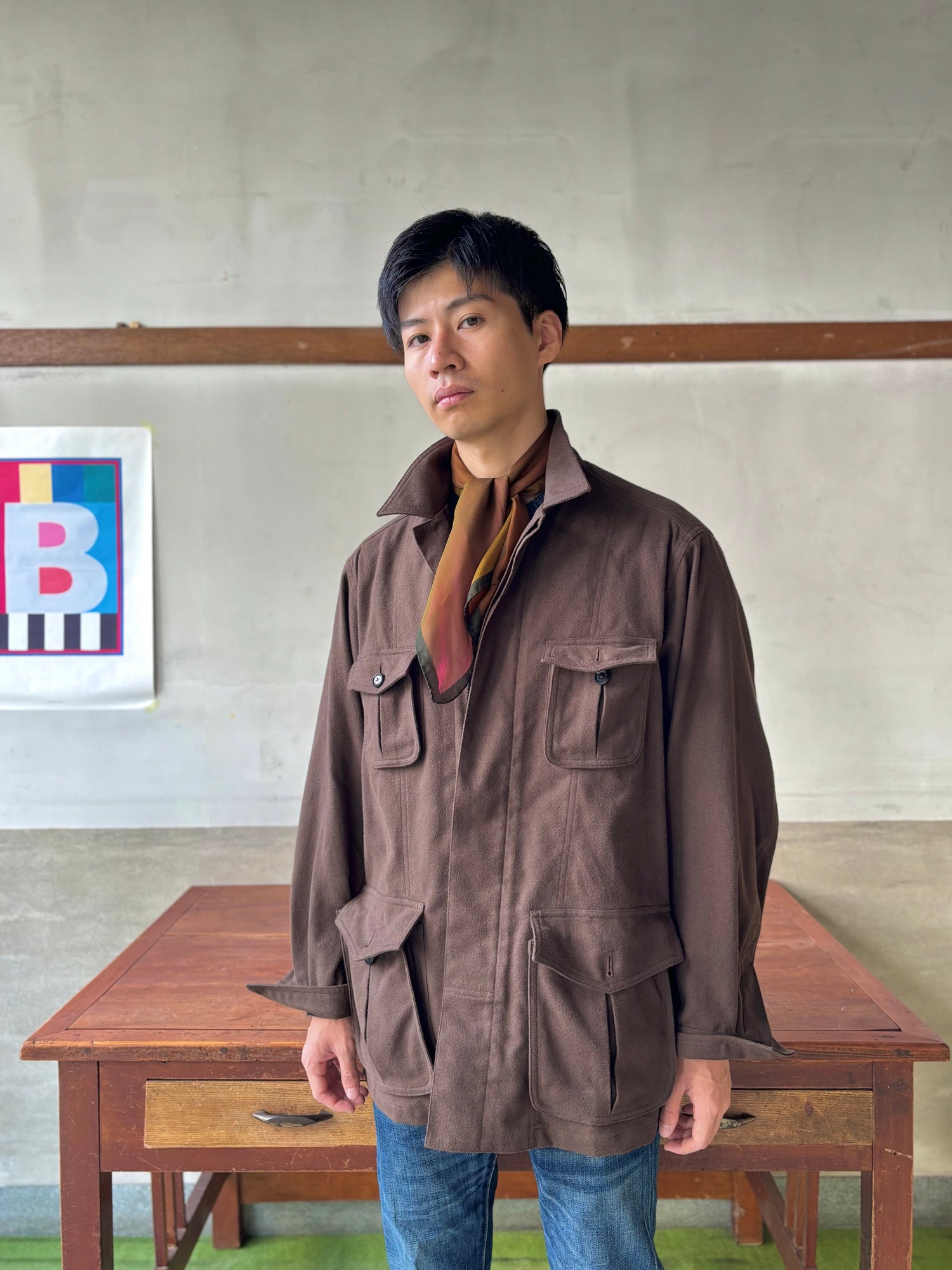 例えばスコットランドのサドル・ショルダーのクルーネック・ジャンパーにコノリーのレザーパンツを穿いて、これを巻くだけでちょっと垢抜けると思うんです。特別な事しなくても良いから、シルク・スカーフ巻いてみましょうよ。